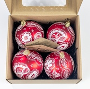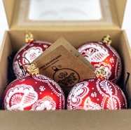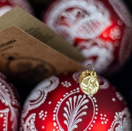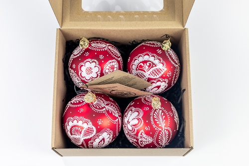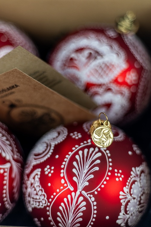 Każda bombka jest inna, zdobiona techniką przypominającą malowanie wydmuszek woskiem – zdobienie jest strukturalne w monochromatycznym kolorze.