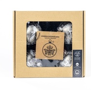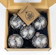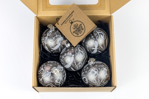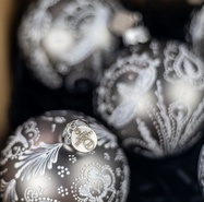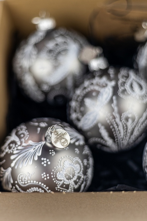 Każda bombka jest inna, zdobiona techniką przypominającą malowanie wydmuszek woskiem – zdobienie jest strukturalne w monochromatycznym kolorze.